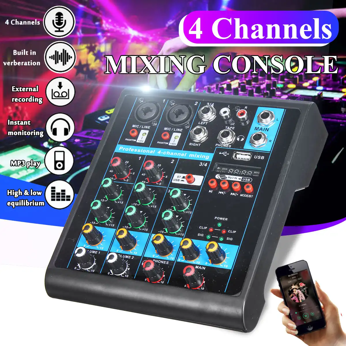 Портативный мини-микшер с 4 каналами, USB, bluetooth, MP3, для прямой трансляции аудио, DJ, звуковая микшерная консоль, караоке, компьютер, 48 В, фантомное питание