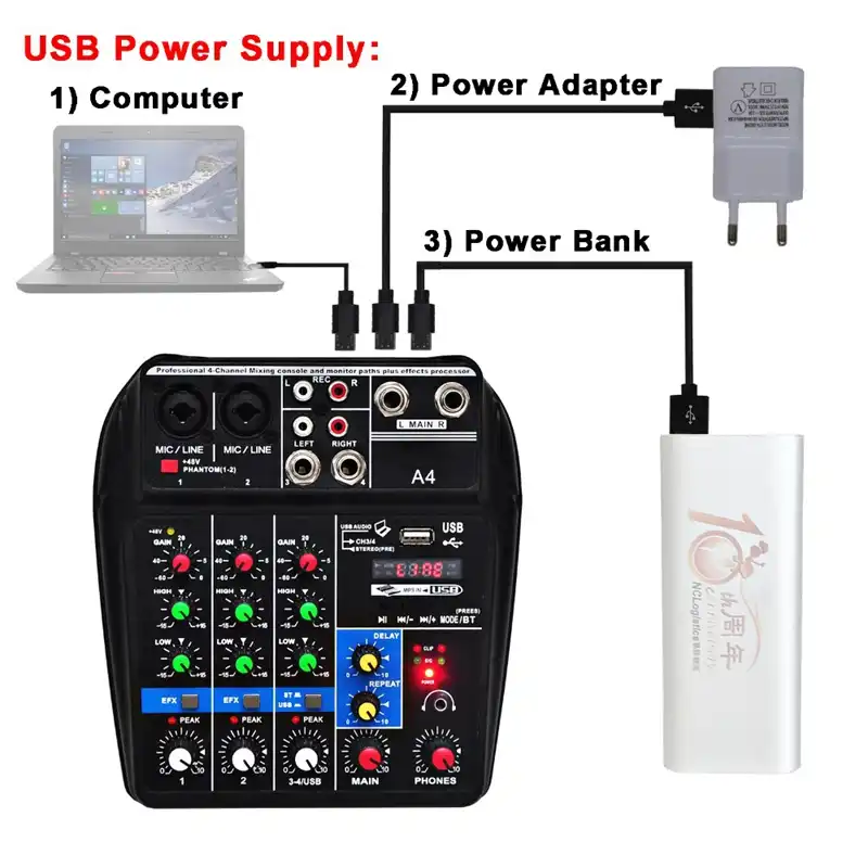 Eu Plug A4 Sound Mixing Console Bluetooth Usb Record Computer Playback 48V Phantom Power Delay Repaeat Effect 4 Channels Usb Aud