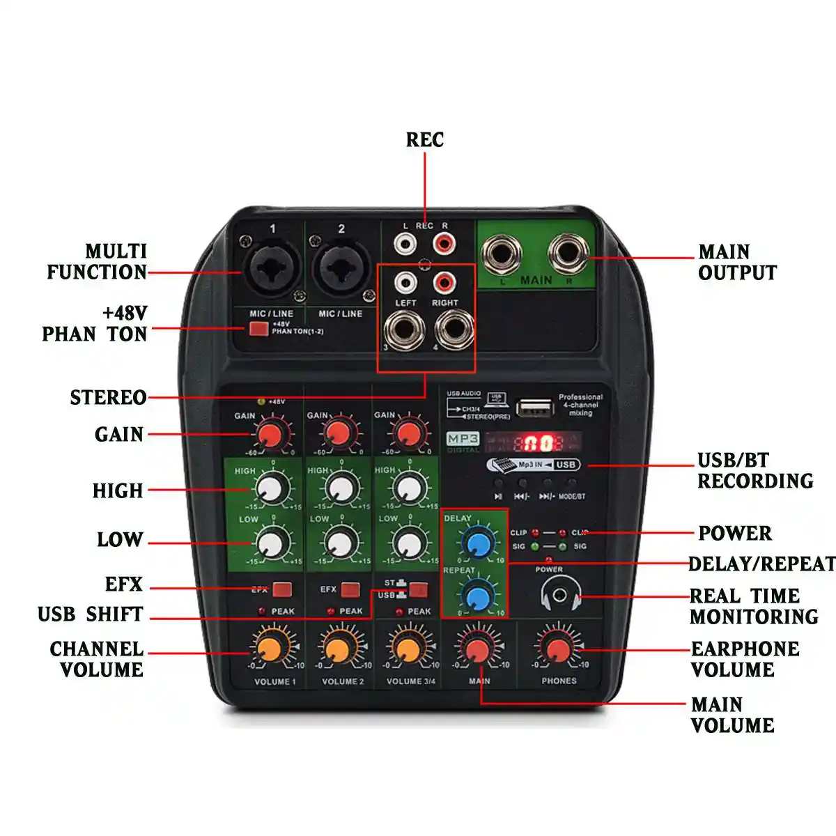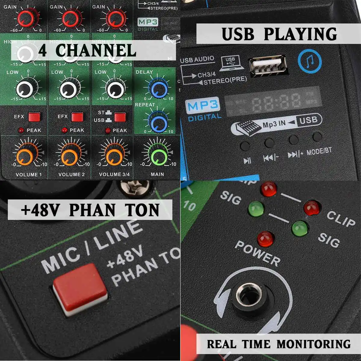 4-канальная микшерная консоль, портативный аудиомикшер с USB, Bluetooth, DJ, звуковое смешивание, MP3 Разъем, караоке, 48 В, усилитель для караоке, KTV Вечерние