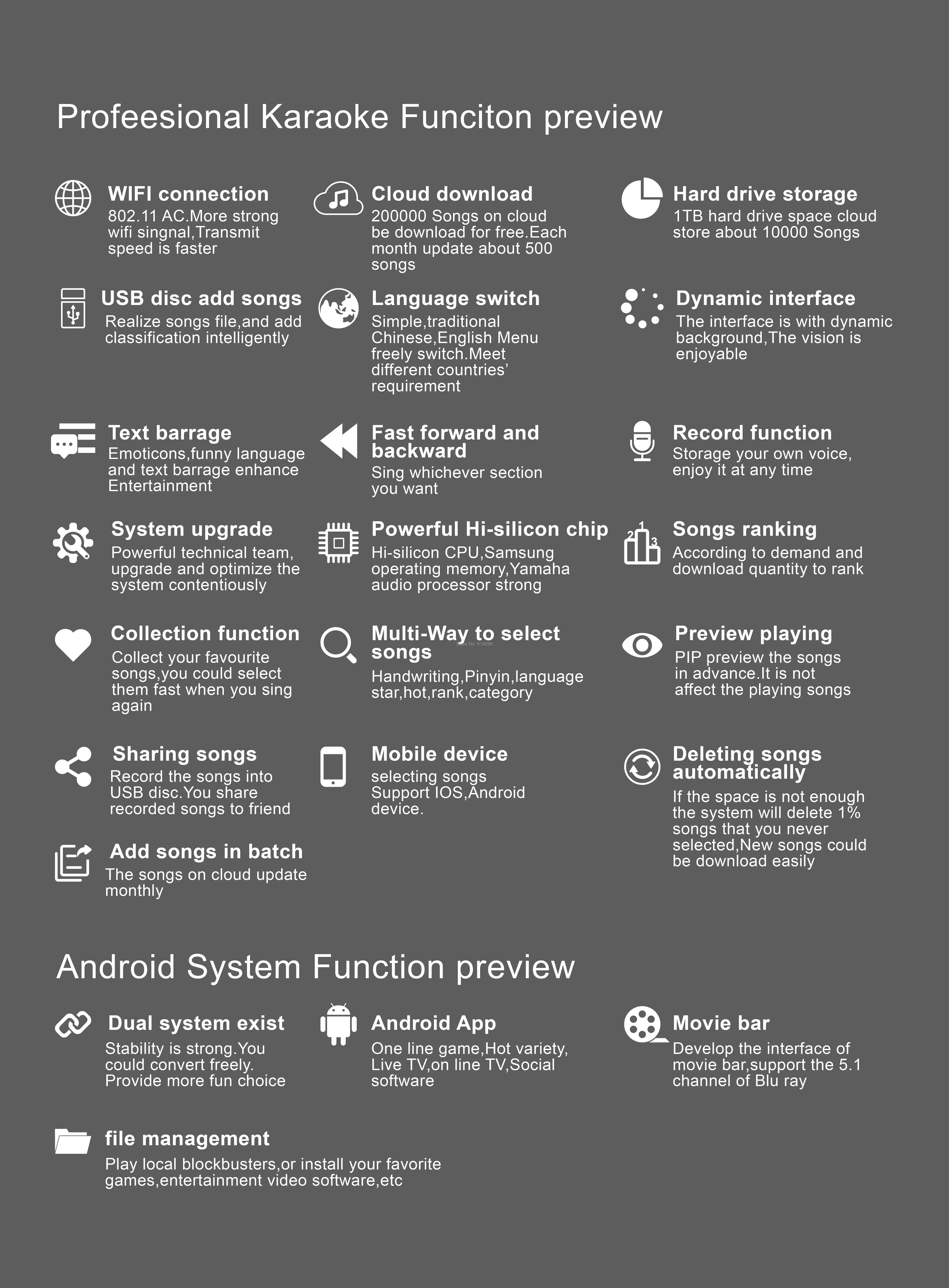 * Полная функция караокеS: забивание и резерв песен, управление клавишами, тон (басы и высокие частоты), эхо, микрофон VOL, музыкальный VOL, вокальный вкл/выкл и т. Д.