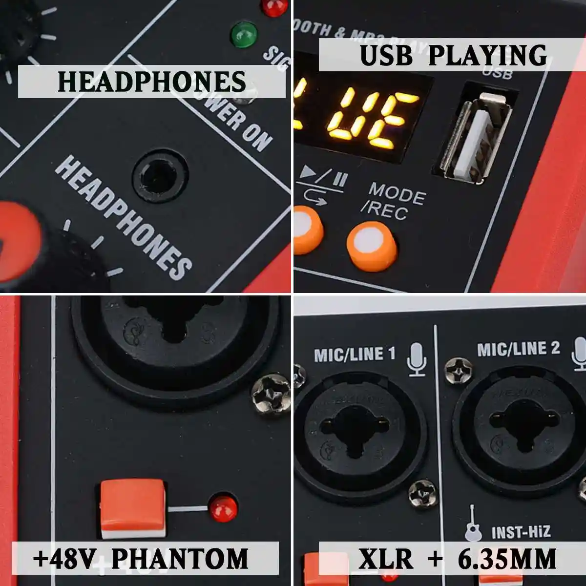 -Миксер оснащен встроенным 48В + фантомным источником питания для прямого питания конденсаторных микрофонов.