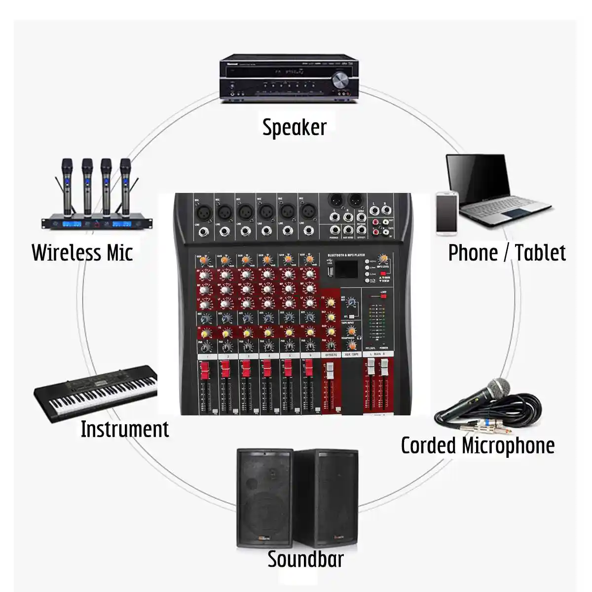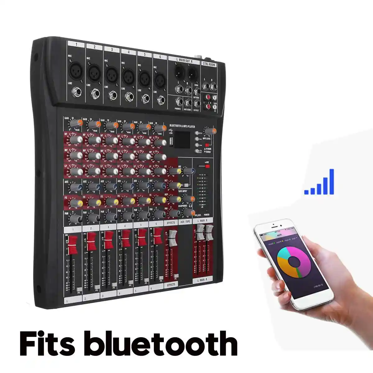 Особенности 1. С 3-я ступенями выравнивания регулирования, регулировочная ручка для регулировки глубины реверберации и задержки эффекта. 2. 6-канальный. 3. Подходит для функции bluetooth для поддержки беспроводной стыковки большинства электронных устройств с поддержкой bluetooth. 4. Разъем USB, его можно подключить к USB флэш-диску или MP3 и другому портативному аудио оборудованию. 5. Есть 6 режимов музыки: природа, популярность, рок, джаз, классика, страна. 6. Поддержка для поддержки проводного/беспроводного/конденсаторного микрофона, подходит для семьи KTV, университетской речи, встречи и т. д. 7. Ультра низкий уровень шума смешанный дизайн головки усилителя. 8. Процессор цифрового эффекта.